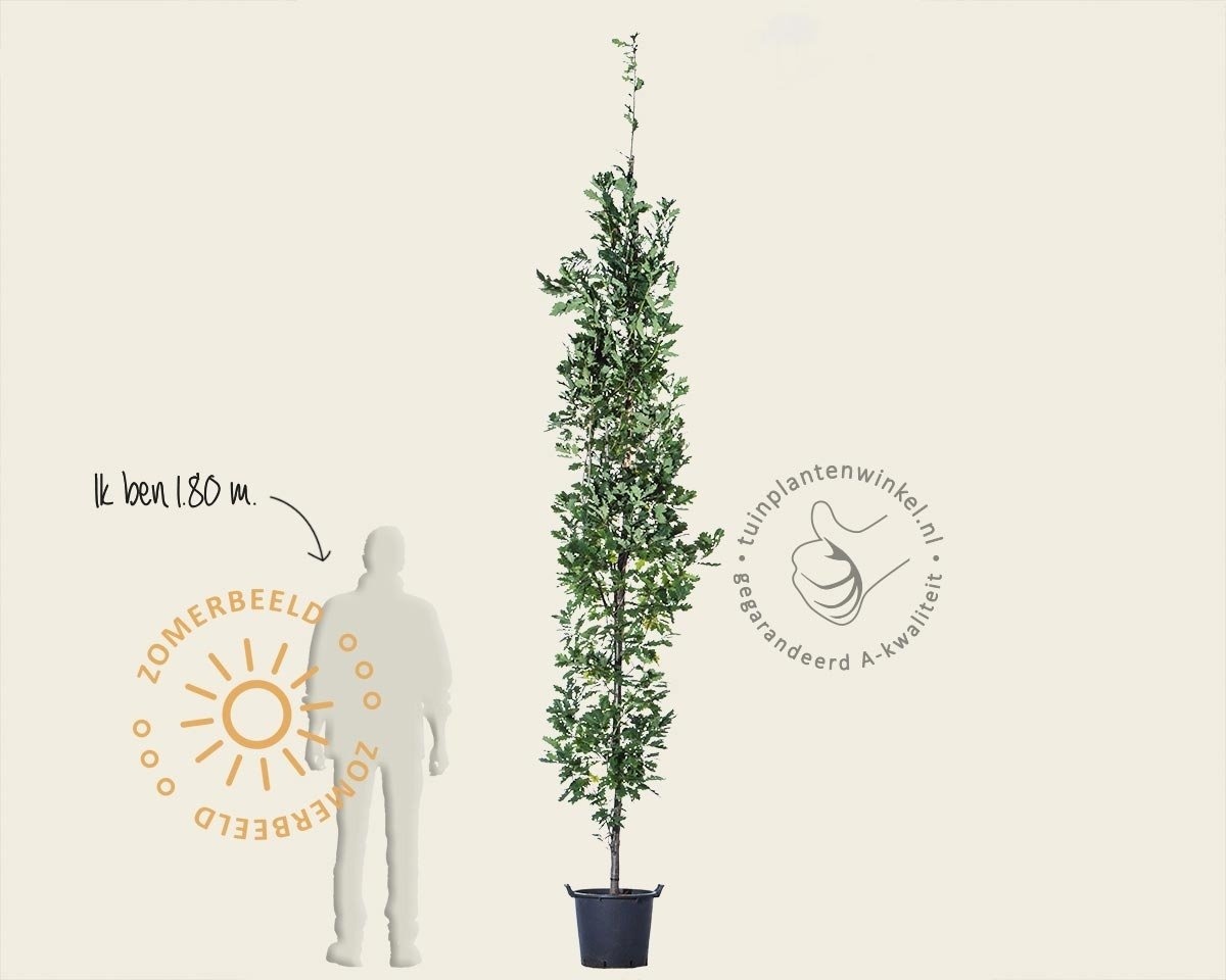 Antwoord: De Zuileik, Quercus robur 'Fastigiata Koster' heeft een zuilvormige groeiwijze en kan gebruikt worden in alle tuinen, ook in kleine tuinen. Houdt er wel rekening mee dat deze boom toch kan uit groeien tot een hoogte van 15 meter en dat deze ook best breed kan worden. De Zuileik kan goed tegen wind. De bomen die oud zijn kunnen een flinke stamomtrek hebben. De kluit vormt flink wortels die diep de grond in gaan. De bomen worden ook regelmatig gebruikt als laan en straatboom. Zorg dat de kluit in de tuin niet verdroogt en geef daarom extra water bij als dit nodig.