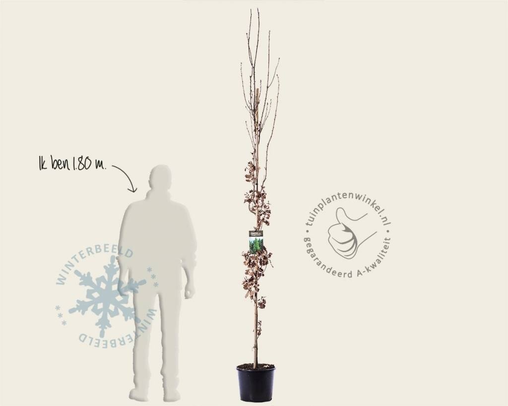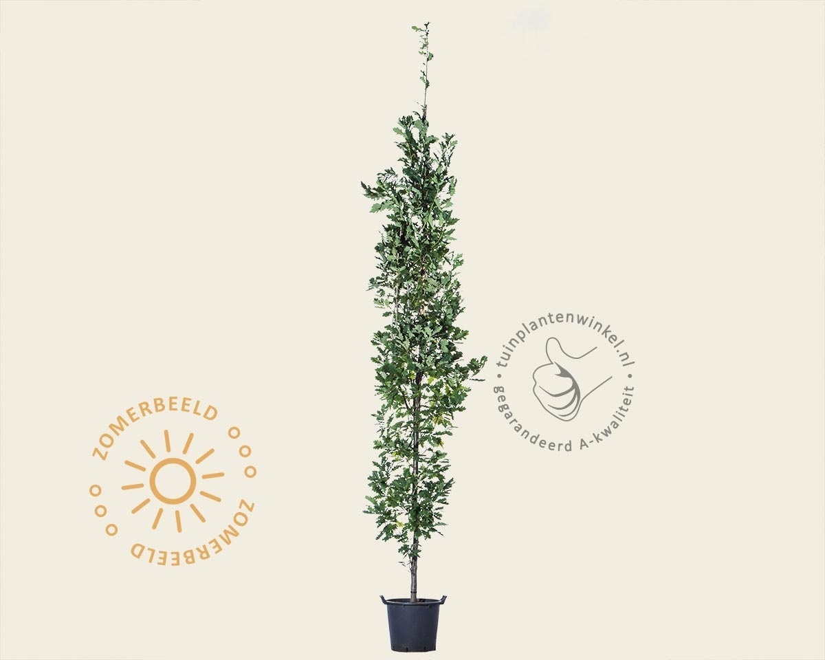 Antwoord: De Zuileik, Quercus robur 'Fastigiata Koster' heeft een zuilvormige groeiwijze en kan gebruikt worden in alle tuinen, ook in kleine tuinen. Houdt er wel rekening mee dat deze boom toch kan uit groeien tot een hoogte van 15 meter en dat deze ook best breed kan worden. De Zuileik kan goed tegen wind. De bomen die oud zijn kunnen een flinke stamomtrek hebben. De kluit vormt flink wortels die diep de grond in gaan. De bomen worden ook regelmatig gebruikt als laan en straatboom. Zorg dat de kluit in de tuin niet verdroogt en geef daarom extra water bij als dit nodig.