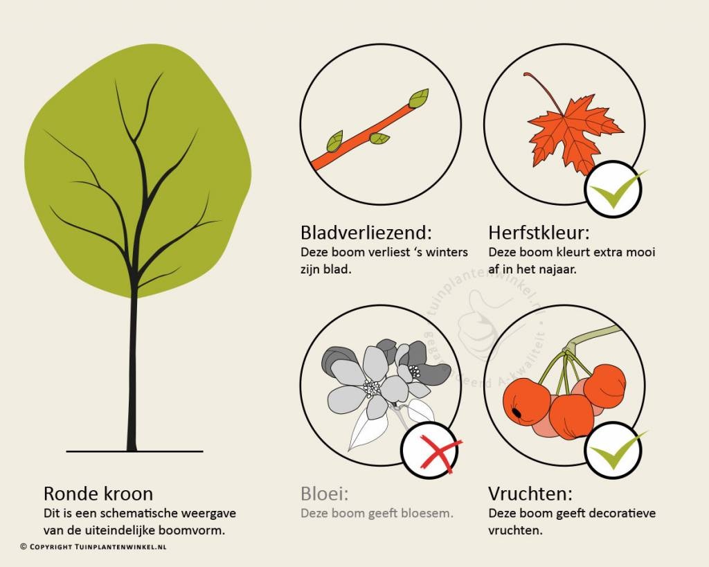 Bomen van Tuinplantenwinkel.nl kunt u jaarrond planten. Dit kan omdat we al onze bomen in pot leveren. Aanplanten in de herfst, winter, lente én zomer is dus altijd mogelijk, met aangroeigarantie!