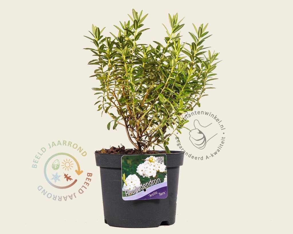 Rhododendron 'Arctic Tern' is een dwergvariant. Deze soorten groeien langzaam en blijven compact en laag van vorm. De tuinplant komt het beste tot zijn recht op een schaduwplekje in de kleinere border. Tijdens de bloei krijgt de Dwerg rododendron talrijke, witte bloemen. De plant is vorstbestendig en behoudt in de winter zijn bladeren.