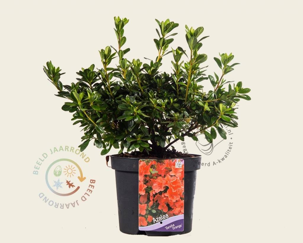 De Japanse azalea is directe familie van de Rhododendrons. Ze groeien langzaam en blijven compact en laag van vorm. Rhododendron Azalea 'Geisha Orange' kan meer zon verdragen dan de 'gewone' Rhododendron. Tijdens de bloei krijgt deze soort oranje bloemen. De tuinplant is vorstbestendig en behoudt in de winter zijn bladeren.