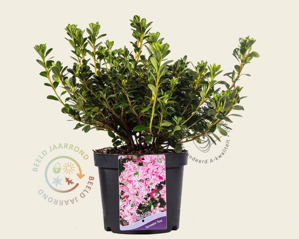 De Japanse azalea is directe familie van de Rhododendrons. Ze groeien langzaam en blijven compact en laag van vorm. Rhododendron Azalea 'Kermesina Roze-Wit' kan meer zon verdragen dan de 'gewone' Rhododendron. Tijdens de bloei krijgt deze soort roze-witte bloemen. De tuinplant is vorstbestendig en behoudt in de winter zijn bladeren.