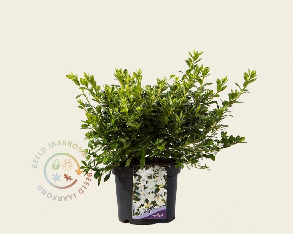 De Japanse Azalea is directe familie van de Rhododendrons. Ze groeien langzaam en blijven compact en laag van vorm. Rhododendron Azalea 'Pleasant White' kan meer zon verdragen dan de 'gewone' Rhododendron en krijgt in april - mei witte bloemen. De Japanse azalea is groenblijvend. Toch kan het zijn dat deze Azalea een herfstkleur krijgt en bij vorst een deel van het blad verliest.