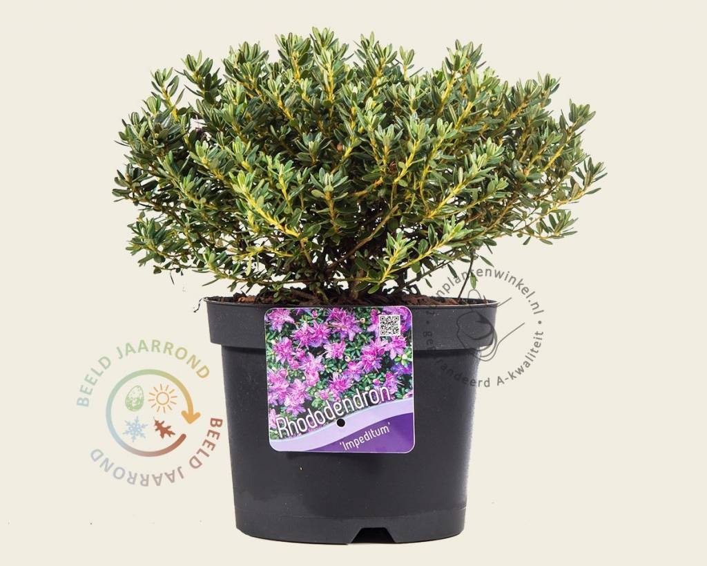 Rhododendron impeditum is een dwergvariant en blijft het laagst van alle soorten. De tuinplant komt het beste tot zijn recht op een schaduwplekje in de kleinere border. Tijdens de bloei krijgt de Dwerg rododendron talrijke paarse bloemen. De tuinplant is vorstbestendig en behoudt in de winter zijn bladeren.