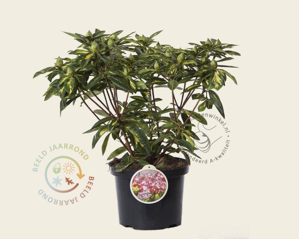 Rhododendron 'President Roosevelt' heeft geelbont blad. In de schaduw licht het blad mooi op. De schaduw is ook de plek waar een Rododendron zich het beste thuis voelt. De bloemen zijn tweekleurig; felroze aan de buitenzijde en lichtroze van binnen. De struik is winterhard en behoudt in de winter zijn bladeren.