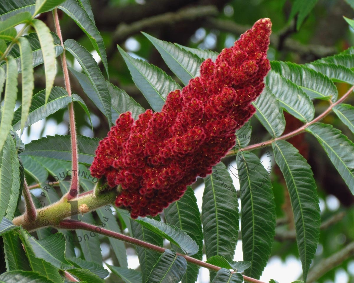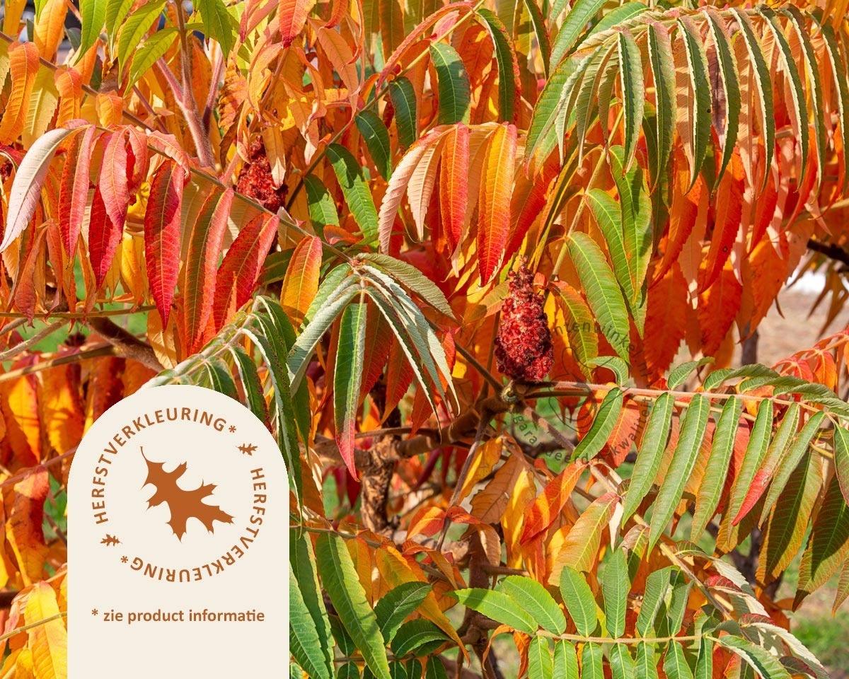 Rhus typhina vind je meestal als een heester die uitgroeit tot een kleine meerstammige boom. Deze variant is wat opvallender omdat deze één rechte stam heeft en als 'hoogstam boom gekweekt is. De Fluweelboom kan tot 6 meter hoog worden en groeit breed uit. De naam Fluweelboom heeft de plant te danken aan zijn fluweelachtige jonge takken. In het najaar krijgt de Rhus typhina een oranjerode herfstkleur. De Fluweelboom bloeit in juni-juli met geelgroene, grote, decoratieve pluimen, die in de herfst donkerrood verkleuren en nog tot in de winter aan de takken blijven zitten.