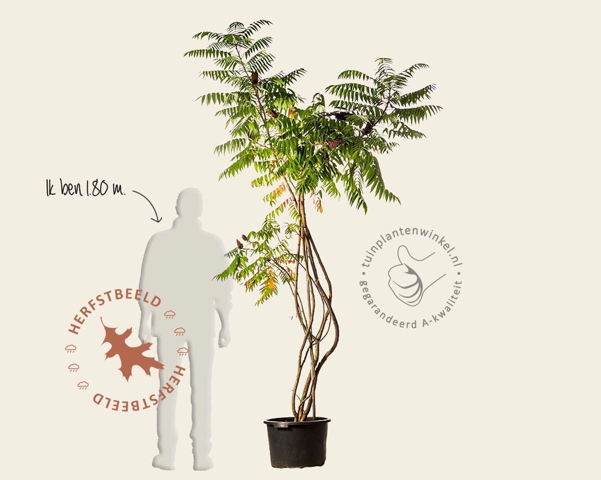 Rhus typhina vind je meestal als een heester die uitgroeit tot een kleine meerstammige boom. De Fluweelboom kan tot 6 meter hoog worden en groeit breed uit. De naam Fluweelboom heeft de plant te danken aan zijn fluweelachtige jonge takken. In het najaar krijgt de Rhus typhina een oranjerode herfstkleur. De Fluweelboom bloeit in juni-juli met geelgroene, grote, decoratieve pluimen, die in de herfst donkerrood verkleuren en nog tot in de winter aan de takken blijven zitten.