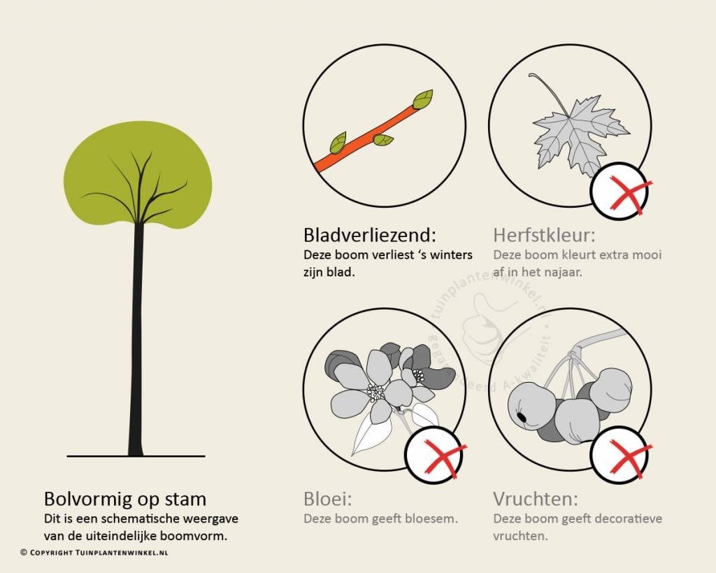 Als u jaarlijks snoeit blijft de kroon compact. Zonder snoei, vormt de boom na jaren een schermvormige kroon. Dan kan hij soms tot 8 m hoogte uitgroeien. Door niet te snoeien zal de bolvorm een afgeplatte vorm krijgen en zal de diameter jaarlijks iets toenemen. De toename is echter bescheiden t.o.v. de groei in het eerste jaar direct na het snoeien.