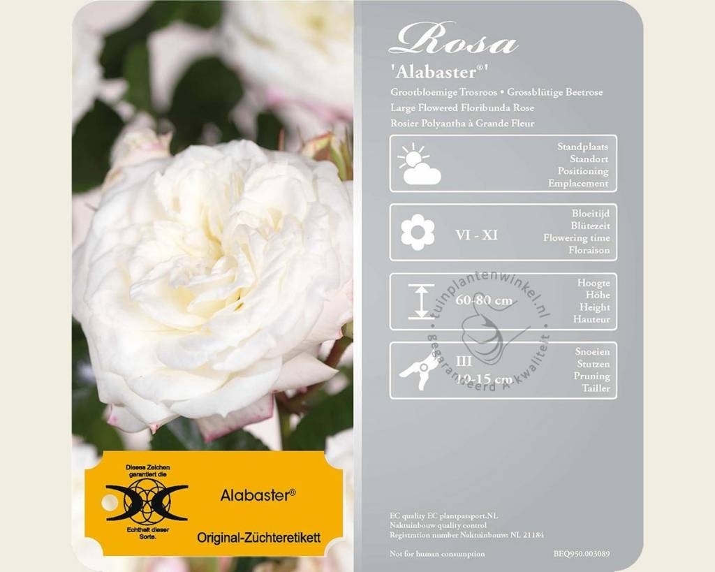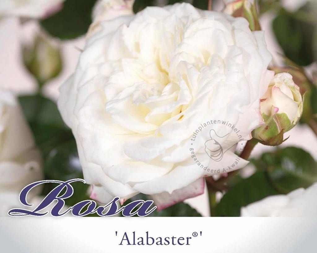 De Rosa 'Alabaster' is een sterk vertakkende struikroos van de veredelaar Tantau. De rozen zijn goed gevuld en geuren niet of nauwelijks. In de knop hebben de buitenste bloembladeren een roze kleur die wanneer de roos opengaat plaatsmaakt voor roomwit. Bij het verwelken van de rozen zijn soms weer roze strepen te zien. De struikroos 'Alabaster' valt op door het gezonde donkergroene blad dat weinig gevoelig is voor rozenziekten zoals meeldauw. De rozen staan in trossen bijeen, soms tot wel 12 rozen per stengel. De struik bereikt een hoogte van ongeveer 80 centimeter. Snoei de Rosa 'Alabaster' in maart terug tot een hoogte van ongeveer 15 centimeter.
