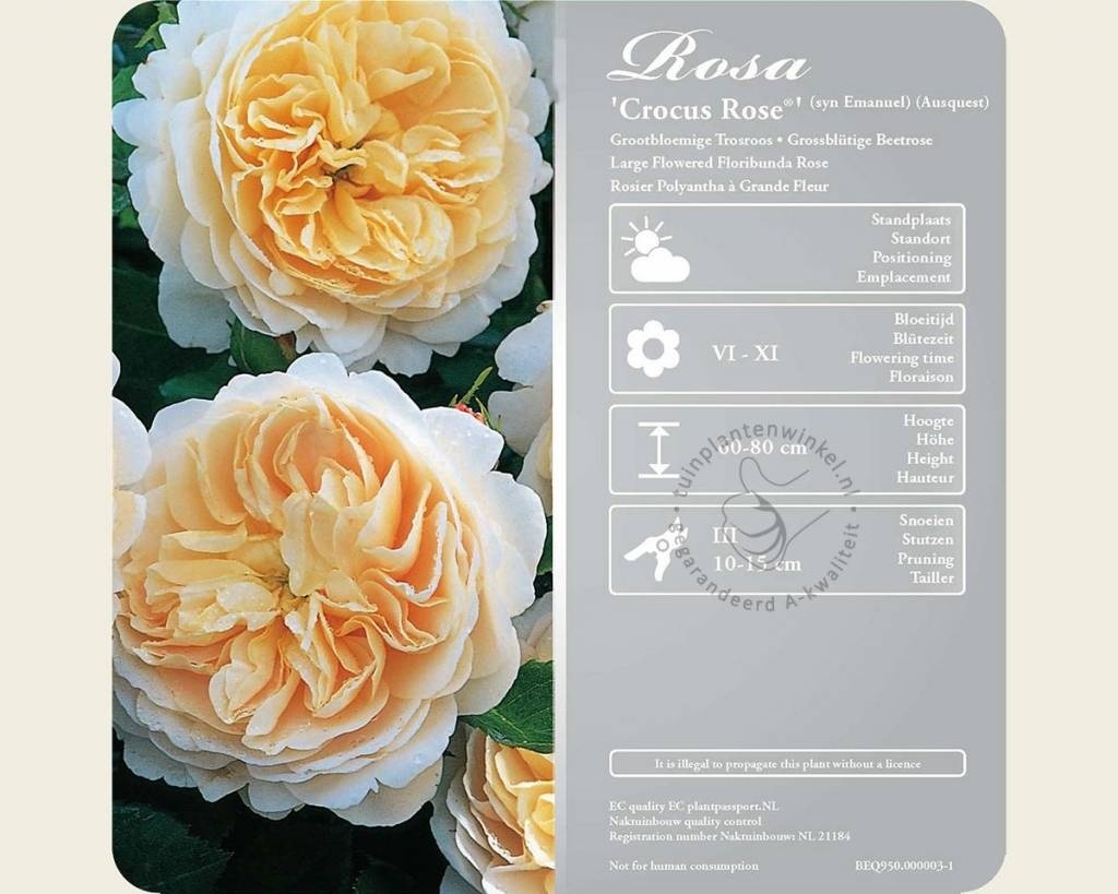 De Rosa 'Crocus Rose' is een sterke en aangenaam geurende struikroos uit de stal van David Austin (David Austinroos / David Austinrozen). Ook deze roos draag alle kenmerken van een Engelse roos: sterk gevulde en sterk geurende bloemen. De 'Crocus Rose' valt op met een krachtige groei en goede herbloei. De 'Crocus Rose' is al onderscheiden met de ‘Award of Garden Merit’ door de Britse Royal horticultural society. De bloei duurt van juni tot aan oktober. Knip twijgen met verwelkte rozen terug zodat de roos opnieuw knoppen vormt die in hetzelfde jaar nog tot bloei komen. Snoei de Rosa 'Crocus Rose' in het voorjaar terug tot een hoogte van ongeveer 15 centimeter. De uiteindelijke hoogte van deze rozenstruik in de zomer bedraagt 80 centimeter. Een synoniem voor deze roos is Rosa 'Ausquest'.