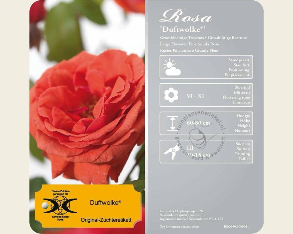 De Rosa 'Duftwolke' geurt heerlijk. Dat kan ook niet anders met zo'n naam. De halfgevulde rozen hebben een aparte koraalrode kleur. Het nieuwe loof heeft een brons/rode gloed die aansluit de rozenkleur. Ook voor de bloei is de struik dus al een een kleurrijke rozenplant. De 'Duftwolke' is een doorbloeiende roos. De rozenstruik begint met zijn bloei in juni en geeft een herbloei tot aan oktober. Snoei de Rosa 'Duftwolke' tot 15 centimeter boven de grond terug in maart. De 'Duftwolke' is een selectie van de veredelaar Tantau (Tantauroos / Tantaurozen).