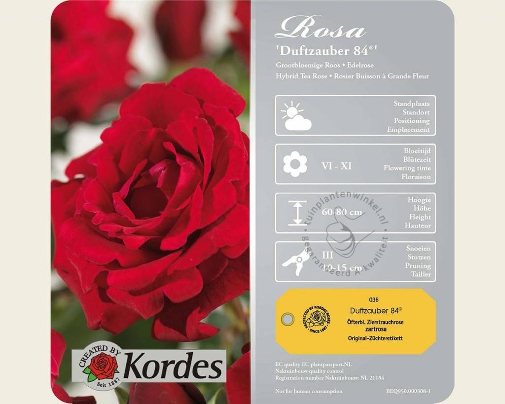 De struikroos 'Duftzauber 84' is rozensoort uit de selectie van de veredelaar Kordes (Kordesroos / Kordesrozen). De Rosa 'Duftzauber 84' doet zijn naam zeker eer aan. De geur van deze grootbloemige roos is sterk en aangenaam. Deze roos behoort tot de theehybriden of theehybriderozen. Dit zijn grootbloemige rozen met stevige stelen. De Rosa 'Duftzauber' is een goedgevulde rode roos en is ook bruikbaar als snijroos. De stevige stengels dragen één tot drie bloemen. Knip na de bloei de stengel deels terug zodat de roos opnieuw gaat bloeien. De bloei duurt dan van juni tot aan oktober. De plant bereikte een hoogte van 80 centimeter. U kunt deze net als bijna alle andere struikrozen in maart terugknippen tot ongeveer 15 centimeter boven de grond. De roos behoort tot de zogenaamde theehybride / theehybriden rozen.