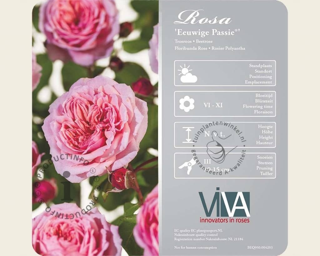 Een bijzonder mooie trosroos die bovendien heerlijk geurt én doorbloeiend is. Die drie eigenschappen komen we samen nog niet veel tegen en dat maakt deze roos al erg bijzonder. Het blad is daarnaast gezond weinig gevoelig voor ziektes. De bloemen van de Rosa 'Eeuwige Passie' hebben aanvankelijk een roze kleur maar verkleuren naar zalmoranje bij het verder opengaan. Voor een goede bloei raden we aan om oude verwelkte bloem(trossen) weg te snoeien. Snoei deze roos in maart terug tot een hoogte van ongeveer 15 centimeter, bezien vanaf de entplaats. De Rosa 'Eeuwige Passie' is een selectie van de veredelaar Martin Vissers (ViVa Roses).