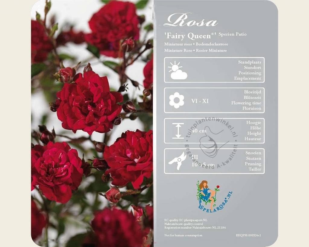 De rosa 'Fairy Queen' is een selectie uit de bekende Fairy roos. De 'Fairy Queen' bloeit met rode bloemen maar deelt voor de rest in de eigenschappen van de 'The Fairy'. Dat betekent een uitbundige én lange bloei van juni tot aan oktober. Deze rozensoort is erg gezond en heeft dus weinig last van ziekten en plagen. De kleine gevulde bloemen verschijnen in trossen. Rosa 'Fairy Queen' bloeit ook zonder te snoeien in de zomer goed door. Alleen in maart snoeit u deze struikroos kort terug. De hoogte van deze struikroos is ongeveer 40 centimeter.