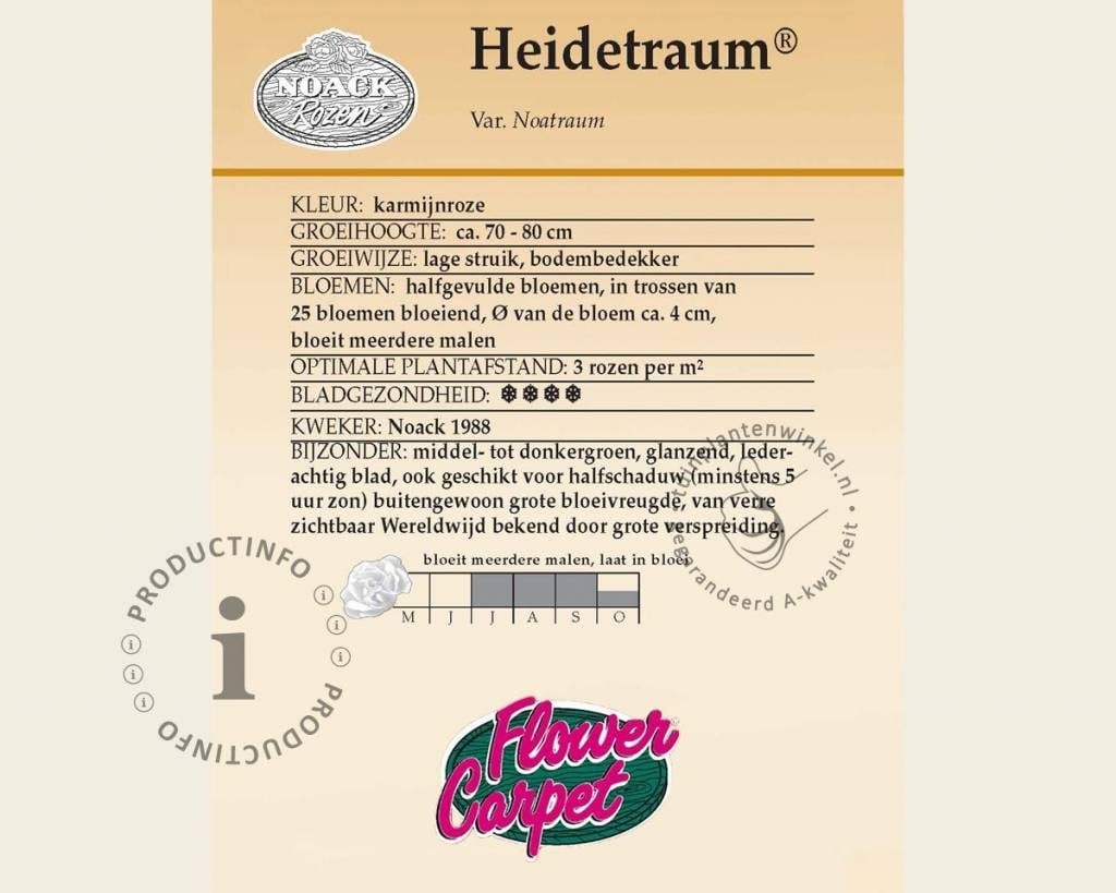 Heidetraum is een roos uit de Flower Carpet-serie. Deze groep rozen blinkt uit in een enorm rijke bloei, uitstekende ziekteresistentie en een breed uitwaaierende groei. Vooral die laatste eigenschap zorgt ervoor dat o.a. de 'Heidetraum' veel wordt gebruikt als bodembedekkende roos of aan de rand van een border. De rozenplanten zorgen dan letterlijk voor één bloementapijt vanaf juni tot diep in september.