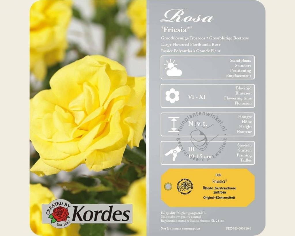 Rosa 'Friesia' is uitgegroeid tot een volwaardige klassieker en niet meer weg te denken uit het assortiment. Deze selectie van de veredelaar Kordes (Kordesroos / Kordesrozen) stamt alweer uit 1977. De Rosa 'Friesia' bloeit met frisgele grote bloemen die aangenaam geuren. De vorm van de roos houdt het midden tussen een grootbloemige en een trosroos. De bloei komt al snel op gang en duurt tot aan oktober. Wanneer u de oude bloemen weg knipt bloeit deze stamroos nog beter door. Het blad is donkergroen glanzend en bovendien gezond. Niet voor niets is deze roos een trotse bezitter van het predikaat Toproos. Knip deze stamroos in maart terug tot ongeveer 15 centimeter vanaf de entplaats voor het beste resultaat.