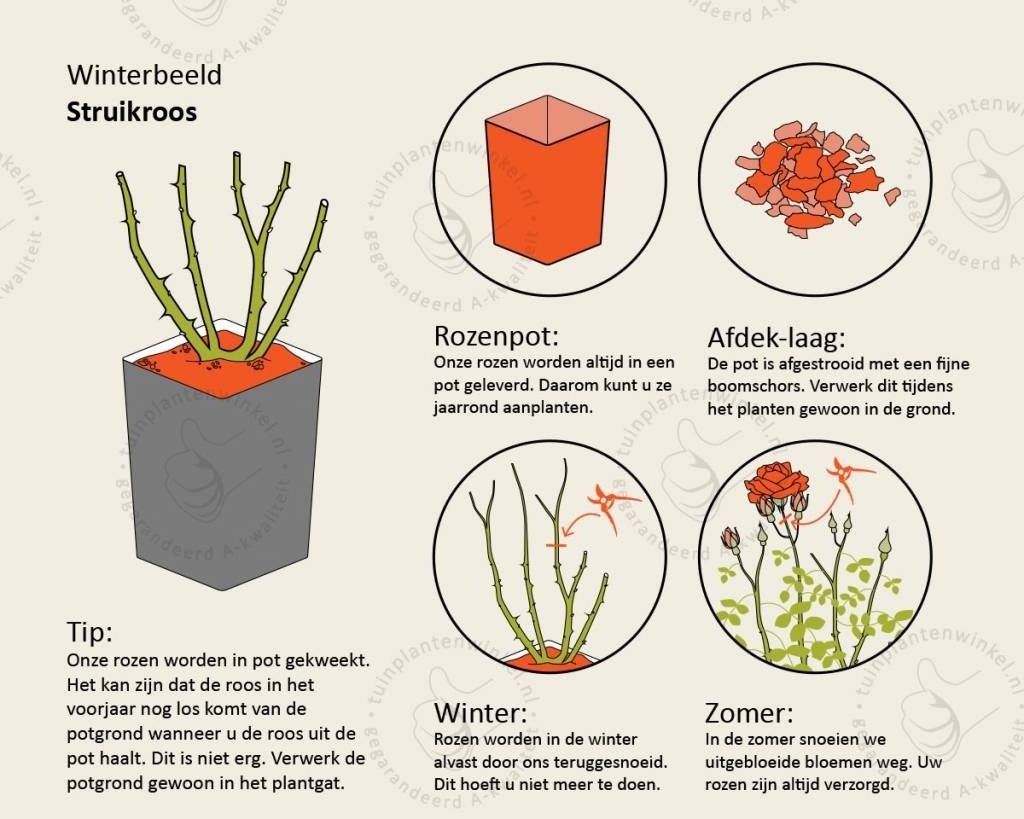 Onderhoud van rozen lijkt moeilijk maar is het zeker niet. Iedereen kan elk jaar weer genieten van mooie gezonde planten die de hele zomer de meest prachtige bloemen geven. Om u hierbij te helpen, hebben we op Tuinplantenwinkel.nl een artikel geschreven met tips over het onderhoud en snoeien van struikrozen. Met behulp van foto's en pictogrammen leggen we het snoeien en onderhoud duidelijk uit. Als u deze tips opvolgt, kunt u jaren genieten van uw nieuwe aanwinst!