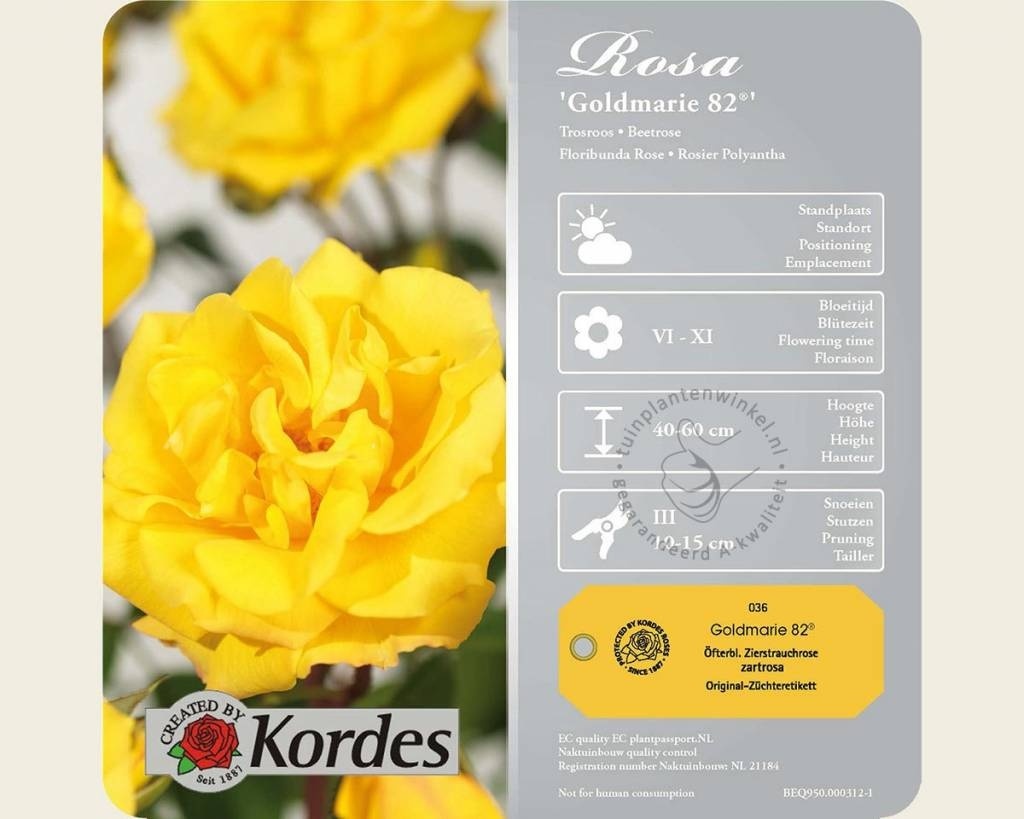 Rosa 'Goldmarie 82' heeft in knop een oranjerode kleur. Wanneer de roos zich opent verkleurt de bloem naar warm oranjegeel en vervolgens verkleuren de oranje randen naar roze. De rozen lichten prachtig op tegen het donkergroen glanzende loof. De bloemen verschijnen in trossen aan stevige opgaande stengels. Daardoor is deze roos ook toepasbaar achter in de border. De struikroos 'Goldmarie 82' is een selectie van de veredelaar Kordes (Kordesroos / Kordesrozen). De hoogte van deze roos is ongeveer 60 centimeter. In maart wordt deze trosroos het best teruggesnoeid tot 15 centimeter. U kunt er ook voor kiezen de plant hoger af te knippen. De roos zal dan in de zomer uitgroeien tot een hogere plant.