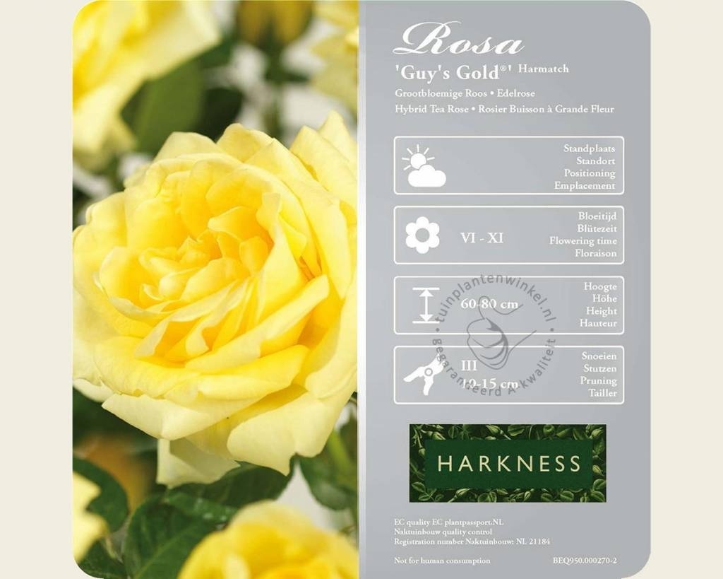 De Rosa 'Guy's Gold' is een recente gezonde rozensoort van veredelaar Harkness (Harknessroos / Harknessrozen). Rosa 'Guy's Gold' geeft grote frisgele bloemen. De bloei begint tamelijk vroeg in vergelijking tot andere rozen. Het is een goede doorbloeiende roos die al nieuwe knoppen maakt terwijl de 'oude' knoppen in bloei staan. Knip de verwelkte bloemen wel weg voor een beter doorbloei. De lichte geur van de bloemen is aangenaam. Het blad is sterk glanzend en gezond. Deze grootbloemige roos is ook als snijroos te gebruiken. De rozenstruik wordt ongeveer 80 centimeter hoog. Het beste knipt u deze roos in maart terug tot ongeveer 15 centimeter boven de grond. De roos behoort tot de zogenaamde theehybride / theehybriden rozen. Een synoniem voor deze roos is de Rosa 'Harmatch'.