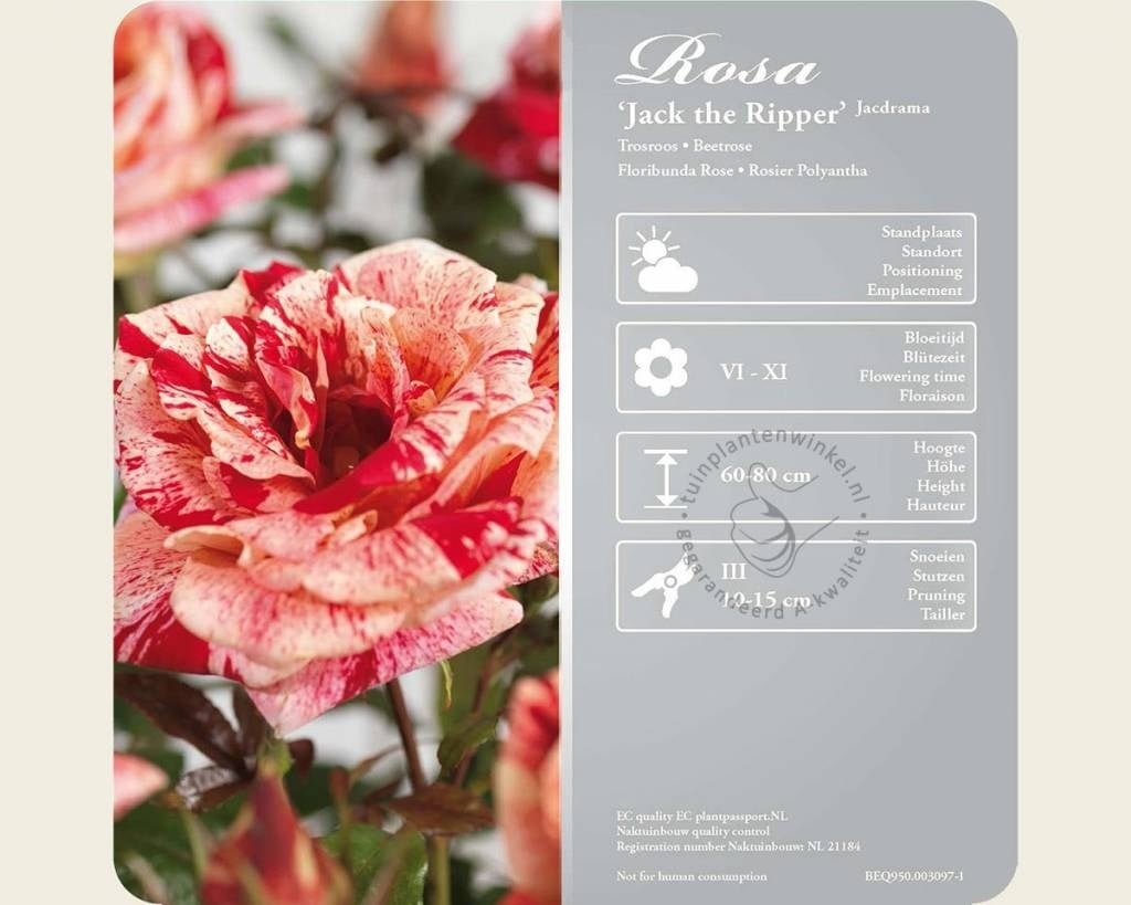 De Rosa 'Jack the Ripper' is een roos apart. Of een aparte roos. De bloemen van deze roos zijn rood-wit gespikkeld maar doordat de kleuren niet altijd evengoed doorkomen zie je ook wel eens een streepje roze of creme-geel. De rozen verschijnen in trossen aan stevige opgaande stelen. De jonge scheuten hebben een rode kleur. De bloemen verspreiden een aangename maar niet overdreven geur. Deze roos is doorbloeiend: de rozen verschijnen vanaf juni tot aan oktober. Knip de stengels met verwelkte rozen deels terug zodat de roos knoppen blijft vormen. In totaal bereikt deze roos in de zomer een hoogte van ongeveer 80 centimeter. Snoei deze roos in voorjaar terug tot een hoogte van ongeveer 15 centimeter boven de grond. De Rosa 'Jack the Ripper' is een selectie van de veredelaar Harkness (Harknessroos / Harknessrozen). Een synoniem voor deze roos is de Rosa 'Rachel Louise Moran'.