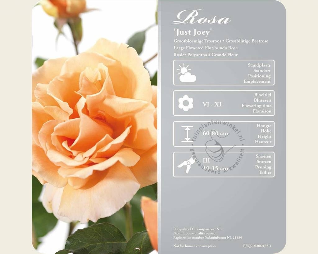 Een echte klassieker onder de rozen. Deze Rosa 'Just Joey' combineert het beste van zijn twee voorouders; de rosa 'Duftwolke' en 'Dr. A. J. Verhage'. Door een kruising van deze rozen ontstond de 'Just Joey'. Een zeer aangename geur en een warme zalmoranje kleur maken deze roos tot een plaatje. De Bloemkleur van deze roos combineert ook prachtig met paarsbloeiende planten zoals de lavendel. De Rosa 'Just Joey' groeit uit tot ongeveer 60 centimeter hoogte en bloeit van juni tot aan oktober. Knip de roos in maart terug tot 15 à 20 centimeter. De roos behoort tot de zogenaamde theehybride / theehybriden rozen. De roos is een selectie van Cants of Colchester (UK).