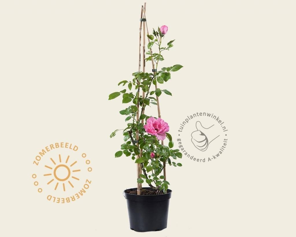 Klimroos Rosa 'Bantry Bay' is een snelgroeiende, grootbloemige roos met van juni t/m oktober grote, halfgevulde, roze bloemen die licht geuren.
