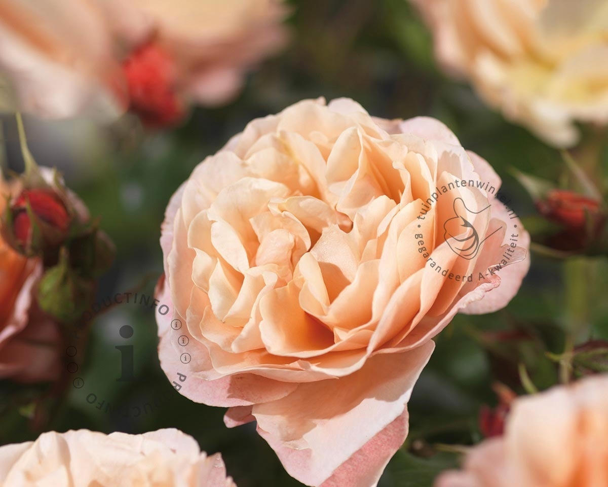 Deze struikroos is geoculeerd op een stam. Hierdoor geniet u van dezelfde prachtige bloemen als bij de struikroos maar dan in de vorm van een compacte boom. Rosa 'Marie Curie' is een gezonde roos met abrikooskleurige bloemen die licht geuren. De bloemen verschijnen in trossen boven compacte stengels. De bloei duurt van juni tot aan oktober. Knip na iedere bloei de uitgebloeide stelen deels terug. Dit bevordert de herbloei. Het blad heeft een donkergroene kleur en is glanzend.