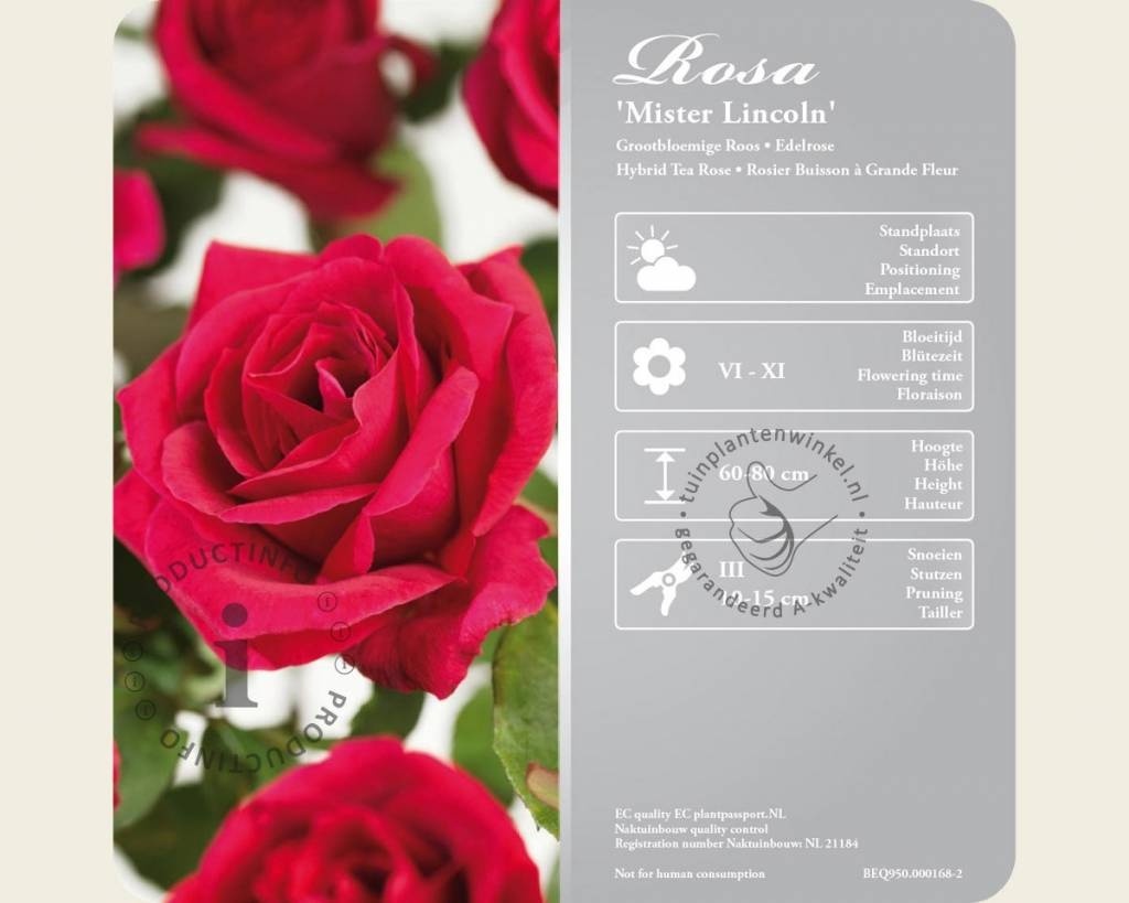 Deze klassieker is een waar plaatje om te zien. Het is een gezonde grootbloemige roos met een klassiek uiterlijk. De rozen staan vaak in enkelvoud aan stevige opgaande stengels, waardoor deze ook prima bruikbaar zijn als snijbloem. De Rosa 'Mister Lincoln' bloeit met stevig gevulde roze-rode bloemen die niet onderdoen voor een gemiddelde snijroos bij de bloemist. Ideaal dus voor een doe-het-zelver die graag een boeket uit eigen tuin plukt. Knip uitgebloeide bloemen terug voor een goede herbloei. Snoei de roos in maart kort terug tot een hoogte van 15 à 30 centimeter. Geef vanaf april voeding in de vorm van een organische meststof (deze kunt u ook kopen bij Tuinplantenwinkel.nl). Deze kunt elke 2 maanden geven gedurende het groeiseizoen.