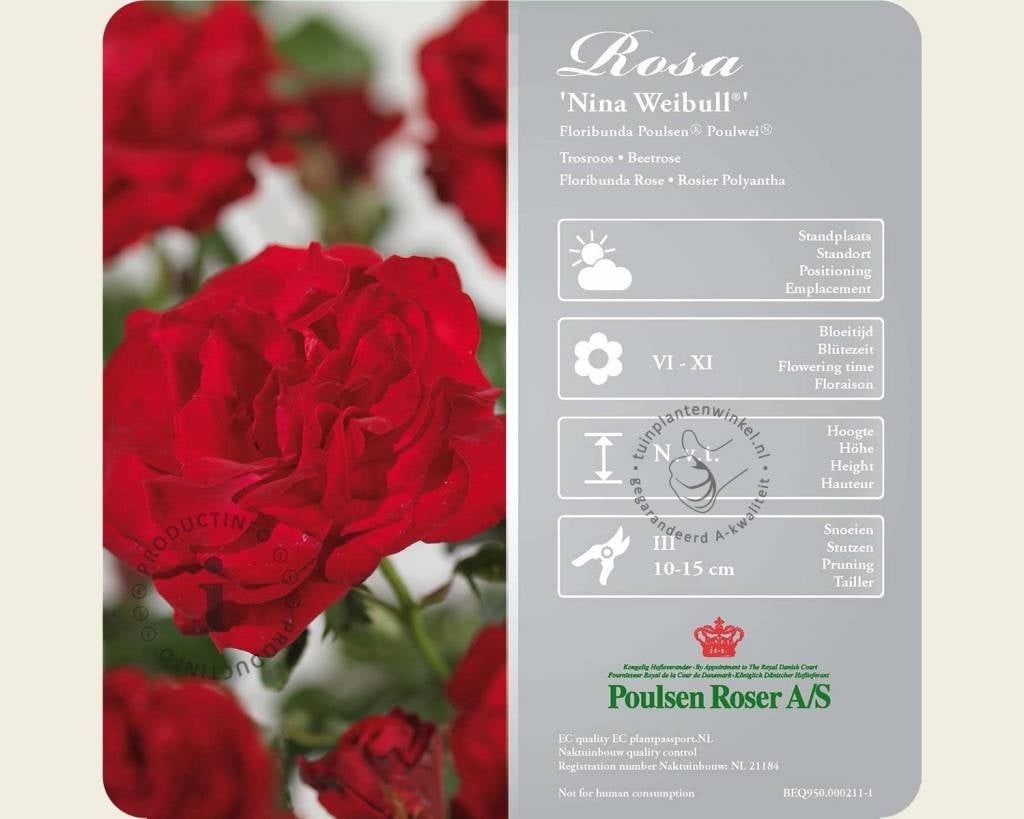 De stamroos 'Nina Weibull' is een erg gezonde rozensoort uit de selectie van de veredelaar Poulsen (Poulsenroos / Poulsenrozen). Nina Weibull is al jaren een vaste waarde binnen het assortiment struikrozen en stamrozen en niet voor niets. De plant bloeit zeer rijk en goed door. De rode bloemen van deze roos verschijnen in grote getalen aan sterke stelen die niet omvallen. Snoei deze struikroos in maart terug tot ongeveer 15 centimeter vanaf de entplaats.