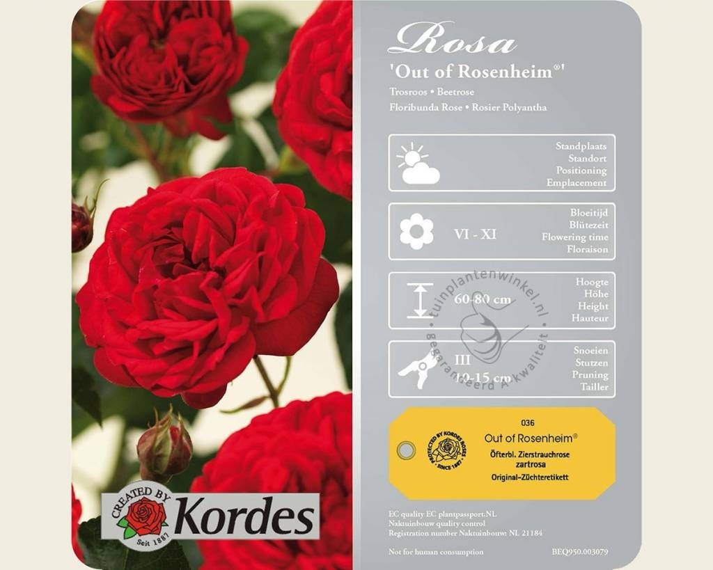 De Rosa 'Out of Rosenheim' is een erg fraaie en zeer sterke trosroos. De bloemen lijken op Engelse rozen maar geuren niet. Ze zijn sterk gevuld en verschijnen in flinke trossen aan vrij stevige takken die soms licht overhangen. De groei is zeer bossig. Deze sterk vertakkende struikroos is daardoor erg geschikt voor vakbeplantingen, perken en zelfs als bodembedekker. De bloei is zeer rijk. De Rosa 'Out of Rosenheim' is een doorbloeiende struikroos met een totale hoogte van juni tot aan oktober. Snoei de roos in maart terugt tot een hoogte van ongeveer 15 centimeter. In de zomer zal deze roos een hoogte van ongeveer 80 centimeter bereiken. Deze rozensoort is een selectie van de veredelaar Kordes (Kordesroos / Kordesrozen).