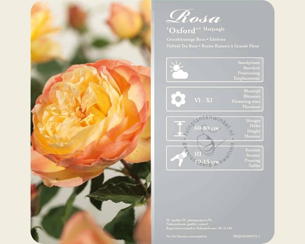 De Rosa 'Oxford' is een sterkgroeiende roos met een sterke fruitige geur. De rozen zijn sterk gevuld en verschijnen in kleine bundels bijeen. De rozen zijn vrij groot met een diameter tot 10 centimeter. De Rosa 'Oxford' bloeit van juni tot aan oktober. Deze roos kan zowel in de breedte als hoogte een lengte van 100 centimeter bereiken. Als u de roos in maart terugsnoeit tot een hoogte van ongeveer 15 centimeter zal de uiteindelijke hoogte ongeveer 80 centimeter zijn. De Rosa 'Oxford' is een selectie van de veredelaar Harkness (Harknessroos / Harknessrozen). Een synoniem voor deze roos is de Rosa 'Well Being' of Rosa 'Harjangle'.
