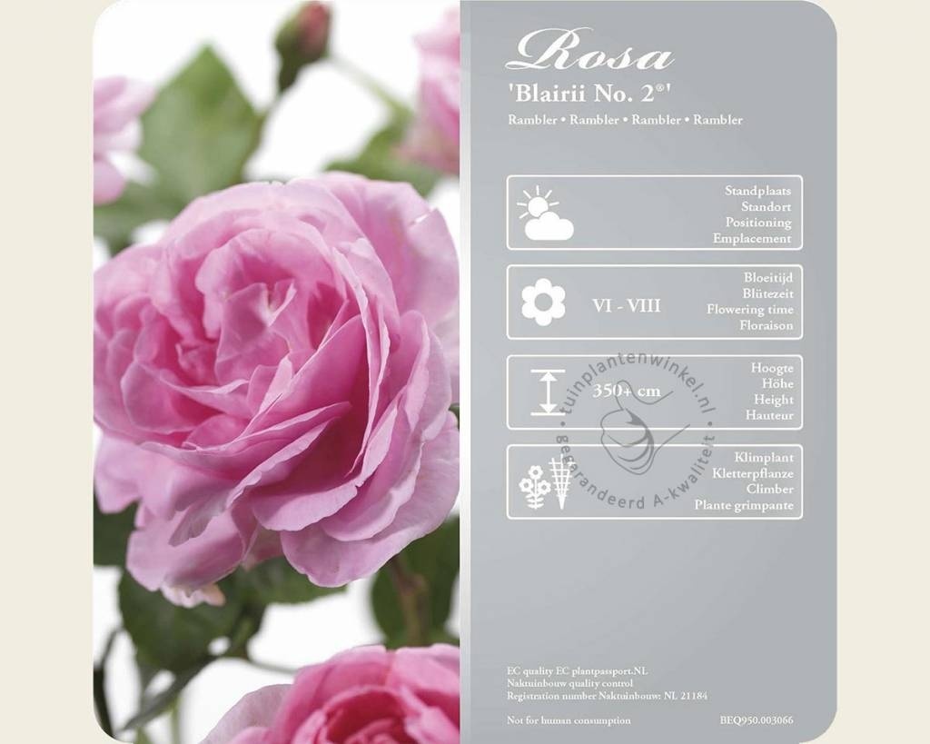 De Rosa 'Blairii no. 2' is een rambler roos met, een voor een rambler roos grote, geurende bloemen. De bloei is zeer rijk en uitbundig en valt in de zomer. Deze roos is niet doorbloeiend. De Ramblerroos 'Blairii no. 2' is een gezonde rozensoort met een sterke groei. Deze klimroos kan een hoogte van 3 tot 4 meter halen. In tegenstelling tot veel andere klimrozen bloeit deze ramblerroos eenmalig. Vaak wordt dit gezien als een tekortkoming; de bloei is echter vele malen rijker dan bij doorbloeiende rozen. Ramblerrozen zijn hard groeiende klimrozen en komen daardoor het beste tot hun recht op een plek waar ze de ruimte krijgen om zich te ontwikkelen. De jonge scheuten maken van deze klimplant in het voorjaar al een kleurrijke plant; deze hebben een rode gloed. De Rosa 'Blairii no. 2' is een selectie van de rozenveredelaar Blair (UK).