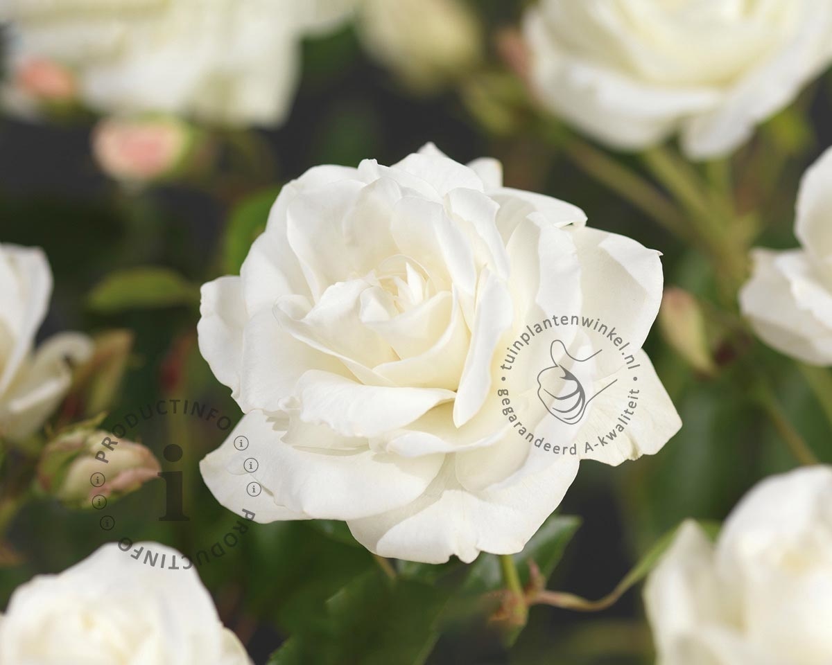 De Rosa 'Schneewittchen' is een klassieker pur sang. Deze roos staat bekend om zijn eindeloze en zeer rijke bloei. De bloemen zijn zuiverwit en vrij open van structuur. Rosa 'Korbin', Rosa 'Sneeuwwitje' en Rosa 'Iceberg' zijn synoniemen voor deze soort. Rosa 'Schneewittchen' is een selectie uit 1958 van de veredelaar Kordes (Kordesroos / Kordesrozen). De roos is jarenlang trotse bezitter geweest van het predikaat Toproos. Waarom niet meer weten wij ook niet, maar het blijft één van onze favorieten. Knip de oude rozen weg zodat de roos rijk doorbloeit van juni tot aan oktober. Deze trosroos bereikt een hoogte van ongeveer 80 tot 100 centimeter. Als u de roos minder diep terugsnoeit kan de roos iets hoger worden. Doorgaans kunt u deze roos het beste in maart terugsnoeien tot 15 centimeter.