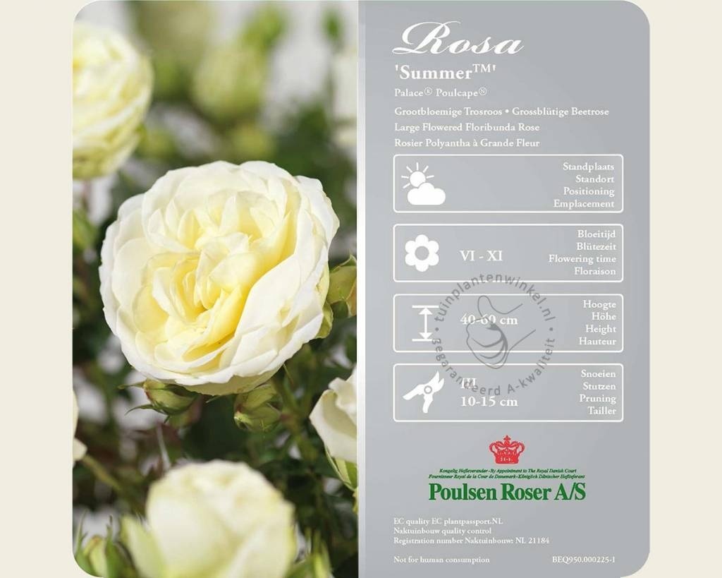 De Rosa 'Summer Palace' is een telg uit de Palace serie van de veredelaar Poulsen (Poulsenroos / Poulsenrozen). Dit zijn allen compactgroeiende struikrozen met een opgaande groei. De stelen van de rozen zijn stevig en vallen niet om zoals bij bodembedekkende rozen. Deze roos wordt ook Rosa 'Summer' genoemd. De naam van de roos vindt zijn oorsprong in de bleekgele bloemkleur. De uiteindelijke hoogte van de 'Summer Palace' is ongeveer 50 centimeter. Ze bloeit van juni tot aan oktober. Als u de stengels met uitgebloeide rozen terugsnoeit is de herbloei nog beter. Geef ook regelmatig mest. Deze roos kan zowel in de tuin als in pot worden geplant. Snoei deze struikroos in maart terug tot een hoogte van ongeveer 15 centimeter.