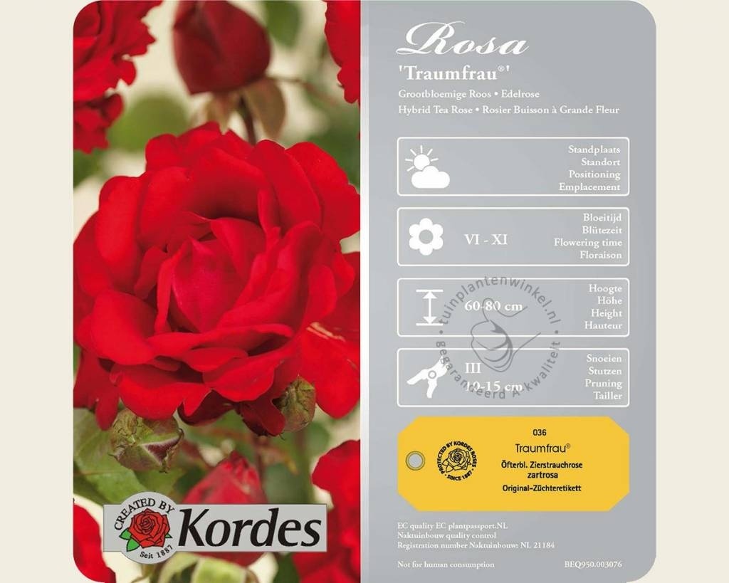 De Rosa 'Traumfrau' is een prachtige rode struikroos met grote stevig gevulde bloemen. De buitenzijde van de bloemen zijn gefranjerd wat de roos onderscheidt van bijvoorbeeld de Rosa 'Dame de Coeur'. De bloemen verschijnen alleenstaand of in kleine groepen bovenaan stevige stelen. Deze struikroos groeit bossig en wordt ongeveer 80 centimeter hoog. De 'Traumfrau' is een doorbloeiende struikroos; ze bloeit van juni tot aan oktober. Zet deze roos in de zon of halfschaduw. Het blad is gezond en heeft weinig last van rozenziektes. Snoei deze struikroos in maart terug tot een hoogte van ongeveer 15 centimeter. De Rosa 'Traumfrau' is een selectie van de veredelaar Kordes (Kordesroos / Kordesrozen). De roos behoort tot de Eleganza-serie. Deze roos is een zogenaamde theehybride roos / theehybriden rozen.