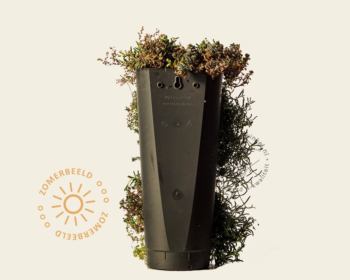 De verschillende blad- en bloemkleuren zorgen jaarrond voor een wisselend en aantrekkelijk beeld. De pot is gemaakt van een stevig kunststof welke jarenlang mee gaat. De pot is voorzien van platte achterzijde waardoor u deze fijn aan een muur of schutting kunt ophangen.