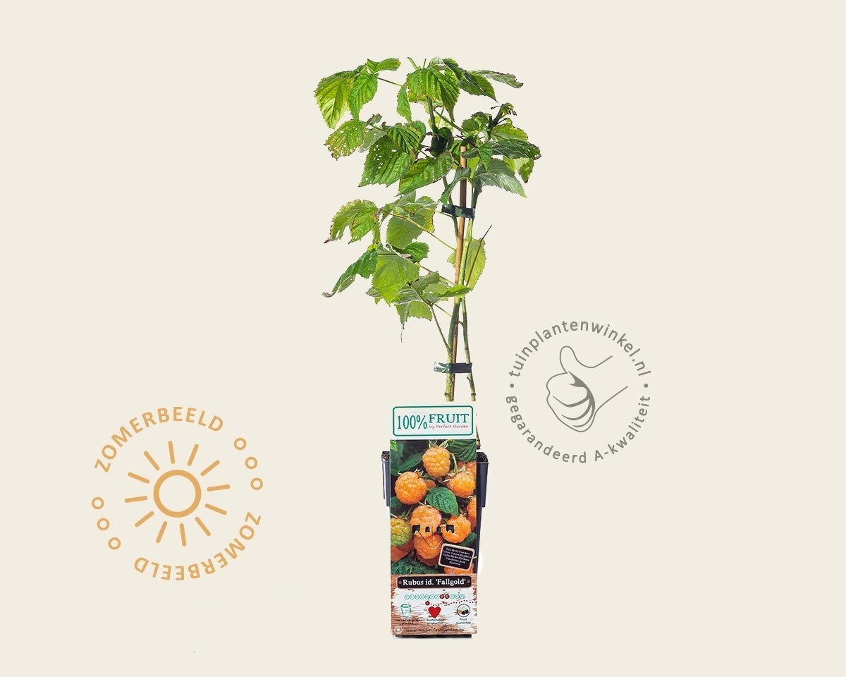 Het lijkt alsof u bij deze Herfstframboos kunt wachten tot u een ons weegt, voordat u kunt beginnen met oogsten. De vruchten van deze tuinplant kleuren maar niet rood..... U heeft het mis; de Rubus idaeus 'Fallgold' is een frambozensoort met gele vruchten! Het eerste wat bij u opkomt, is waarschijnlijk het idee dat ze niet zoet zullen smaken, maar niets is minder waar. Misschien zijn ze zelfs nog wel zoeter dan de rode frambozen. Rubus idaeus 'Fallgold' is een Herfstframboos. Er is nog een framboos met gele vruchten. Dat is de Rubus idaeus 'Golden Everest', waarvan de vruchten al eerder rijp zijn. De vruchten van de Rubus idaeus 'Fallgold' zijn wat kleiner; ze smaken wel erg lekker!