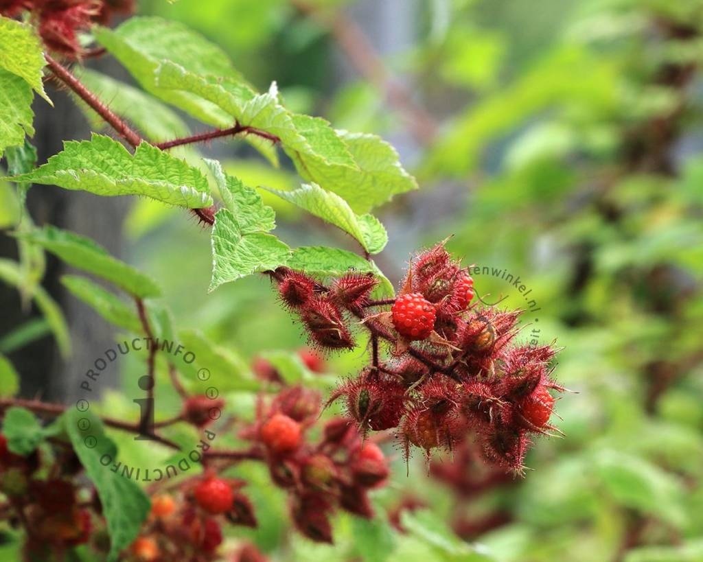 De Japanse wijnbes is familie van de roos, is een stekelige plant en heeft ook kleine doorntjes. Rubus phoenicolasius is zelfbestuivend.
