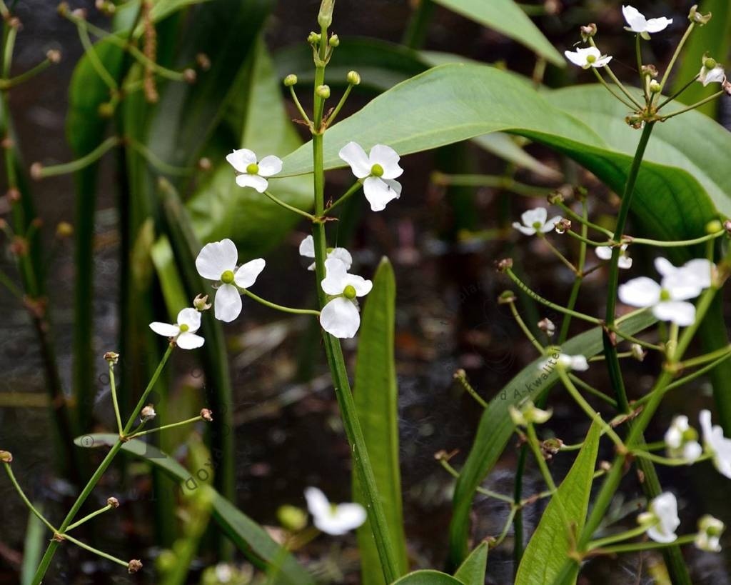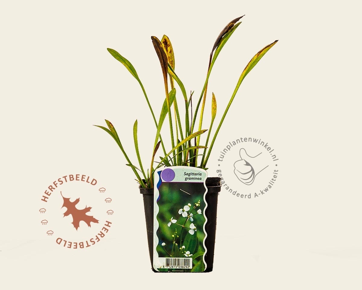 Sagittaria graminea is een waterplant voor in de vijver. Toch kan het Smalbladige pijlkruid ook aan de rand van de vijver prima groeien. Sagittaria graminea heeft twee soorten blad. Onder water groeien smalle, langwerpige bladeren die vanaf de voet van de plant beginnen. Boven het water groeien lepelvormige bladeren. Een deel van dit blad groeit dus onder water. De winterhardheid van de Sagittaria graminea is goed. In de zomer krijgt deze tuinplant witte bloemen die aan stengels groeien en boven het blad uitsteken. Dit zijn de mannelijke bloemen. Aan dezelfde plant staan ook vrouwelijke bloemen. Deze staan lager in de waterplant en zijn veel minder opvallend en wat groenachtig van kleur.