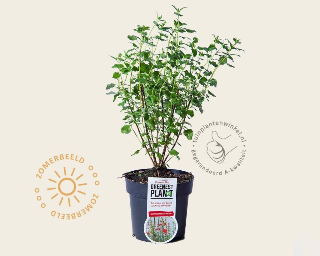Salvia microphylla 'Hot Lips' is kleinbladig en krijgt in juli - augustus - september - oktober aparte, tweekleurige bloemen in rood en wit; in warme nachten verdwijnt de witte kleur en verkleurt de bloem helemaal rood. Salvia Hot Lips is een geweldige plant voor vakbeplanting in de border maar is ook geschikt als solitair in een kuip op het balkon of terras. Deze Salvia Hot Lips verliest in de winter zijn bladeren en is matig tot goed winterhard. Deze mooie plant combineert prima met andere heesters en vaste planten in uw border. De bloemen zijn rood - wit, geurend en trekken vlinders, bijen en andere insecten aan.