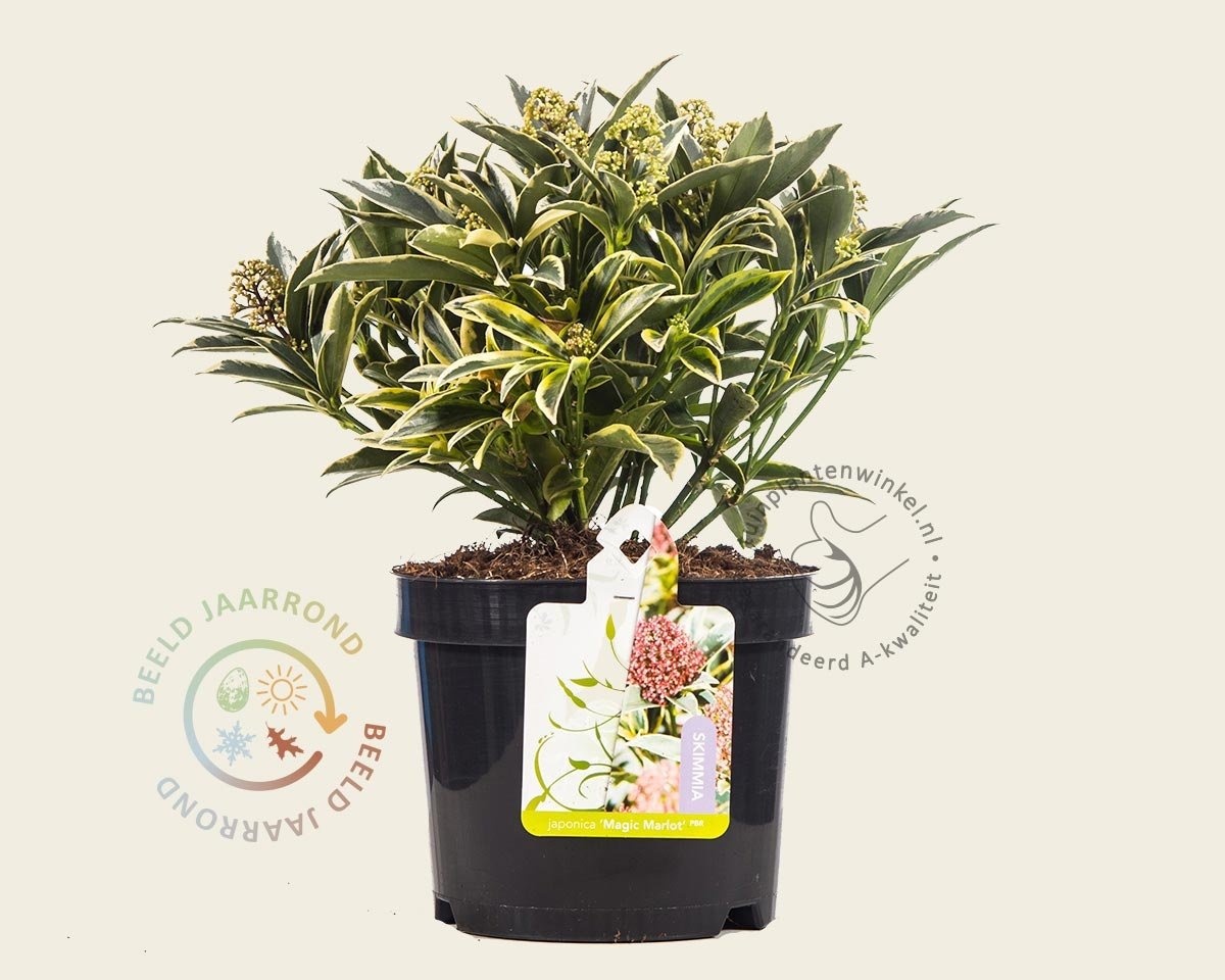 Skimma japonica 'Magic Marlot' is met zijn rode bloemknoppen en bont blad een opvallende tuinplant. Het lichtgroene blad heeft witte strepen, de bloemknoppen zijn roze/rood en geven sierwaarde in het najaar en de winter. In het voorjaar bloeit de dwergskimmia met witte bloemen. Op vele momenten in het jaar is het een opvallend struikje in de (kleinere) border, in een pot op het balkon of balkon. De mannelijke soort krijgt geen besjes.