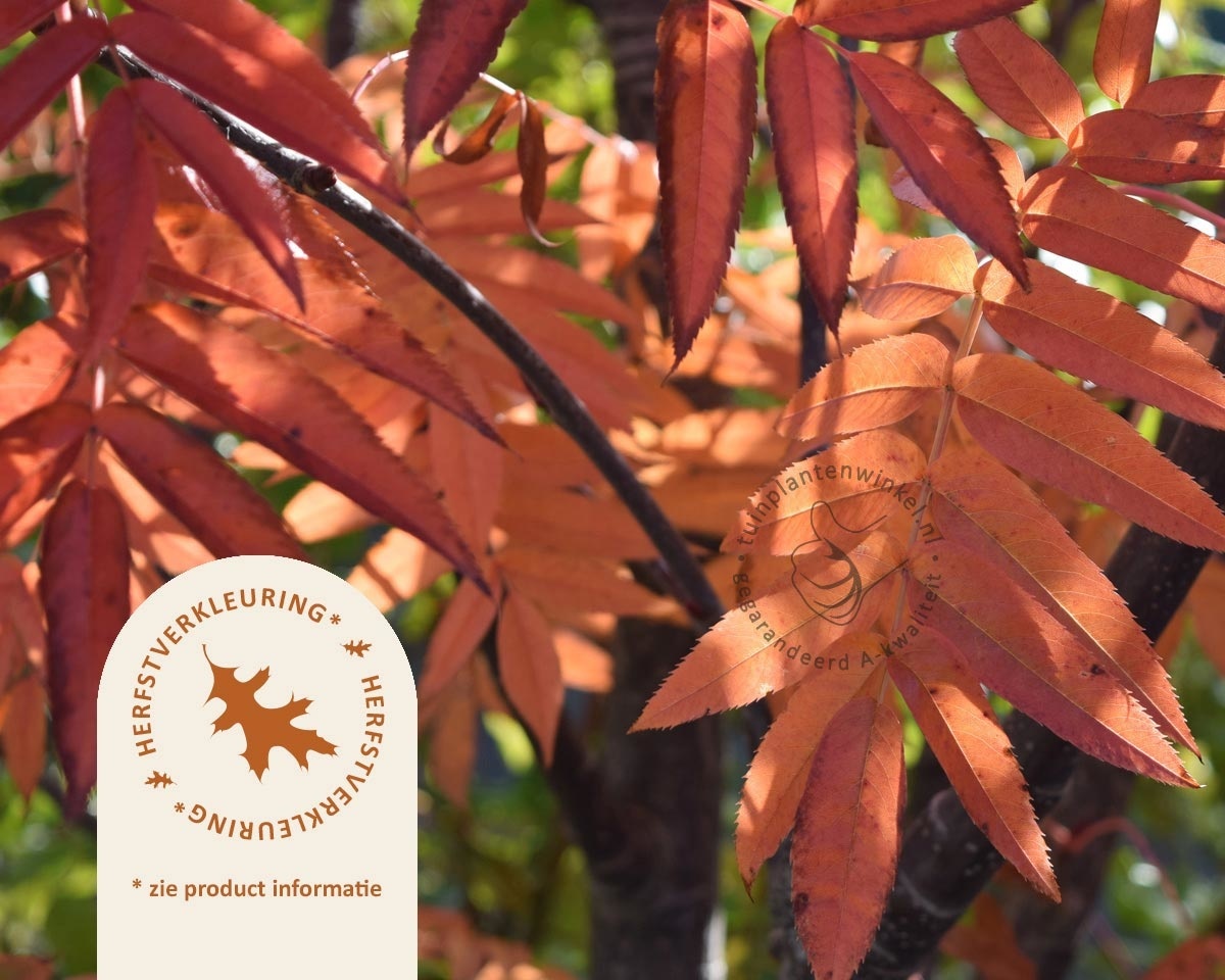 Het blad van deze plant verkleurt in het najaar. De kleuren op de foto geven een indicatie van deze verkleuring. De exacte verkleuring is afhankelijk van de standplaats en het weer en kan per jaar verschillen. Het is dus niet zeker of u de verkleuring zoals deze gefotografeerd is, ook terugziet in uw tuin. Aan de kleuren die op deze foto zichtbaar zijn, kunnen geen rechten worden ontleent.