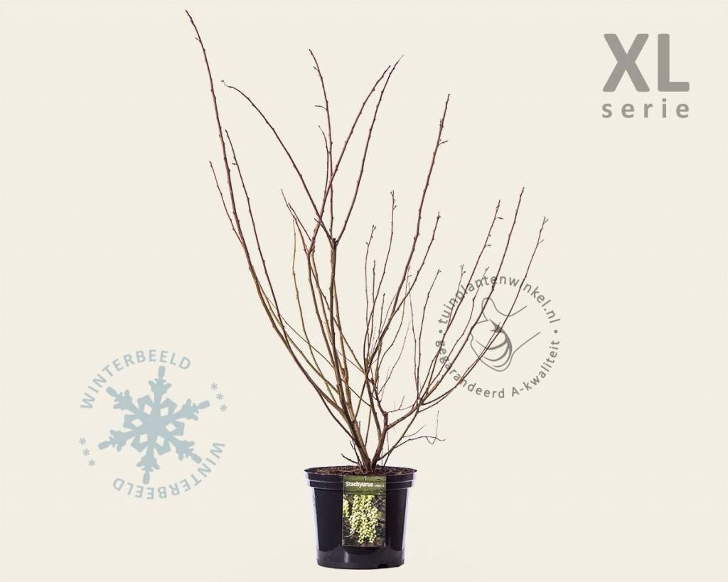 Stachyurus praecox - XL wordt in het Nederlands Staartaar genoemd. Deze tuinplant is een middelgrote, meerstammige struik met een rond opgaande vorm. Bijzonder is de bloeiwijze: van eind februari tot april bloeit de Staartaar met opvallende, groengele bloemen in lange trossen. De middelgroene bladeren zijn ovaal en staan aan roodpaarse twijgen. In de herfst verkleuren de bladeren goudgeel. Daarbij lokt de Staartaar bijen en insecten naar uw tuin en heeft de struik weinig last van ziektes of ongedierte.