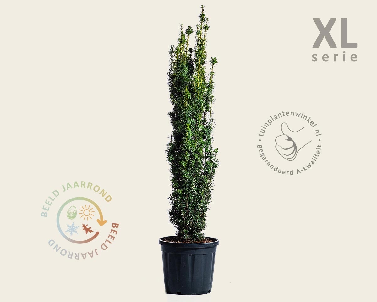 Taxus baccata 'David' heeft een zuilvormige groeiwijze. Dat betekent dat deze Taxus smal blijft en bijna geen snoei nodig heeft. De potgekweekte Venijnboom is het hele jaar door aan te planten. Taxus baccata 'David' heeft een mooie vorm. De tuinplant is wintergroen, waardoor hij het hele jaar met het geelgroene, naaldvormige blad de tuin siert. In het najaar vormen zich rode bessen. Deze Venijnboom groeit uit tot 200 cm. De tuinplant is goed te combineren met allerlei vaste planten.