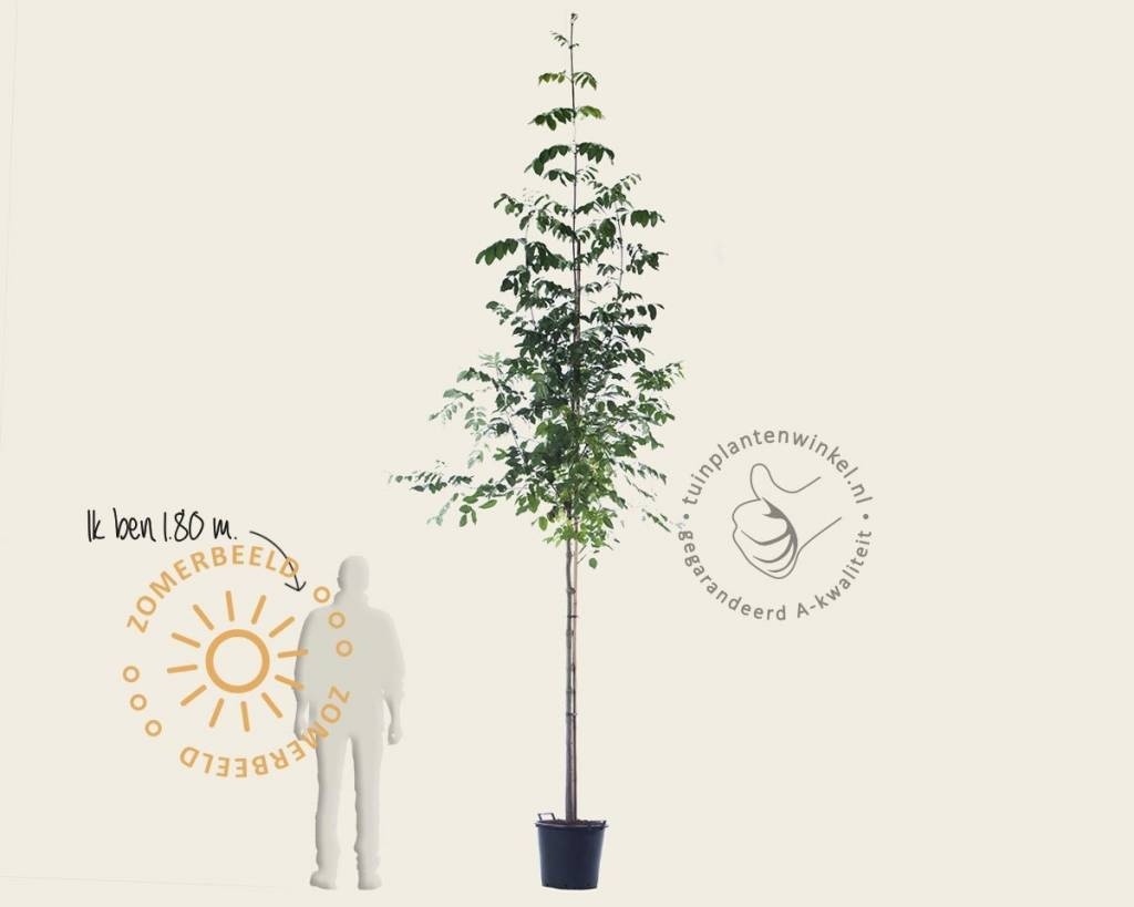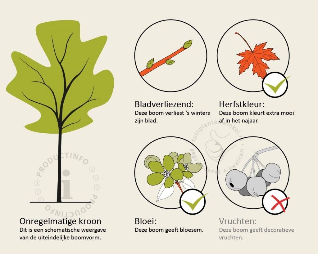 Omdat de boom in de kwekerij in pot gekweekt wordt, heeft hij een goed wortelgestel en kunt u hem het hele jaar door op de gewenste locatie planten, dus ook in de zomer. Het is geen kleine boom en als hoogstam vorm daarom minder geschikt voor een kleine tuin. Hij is gevoelig voor wind, we adviseren daarom altijd 1 of 2 boompalen te gebruiken als u hem aanplant.