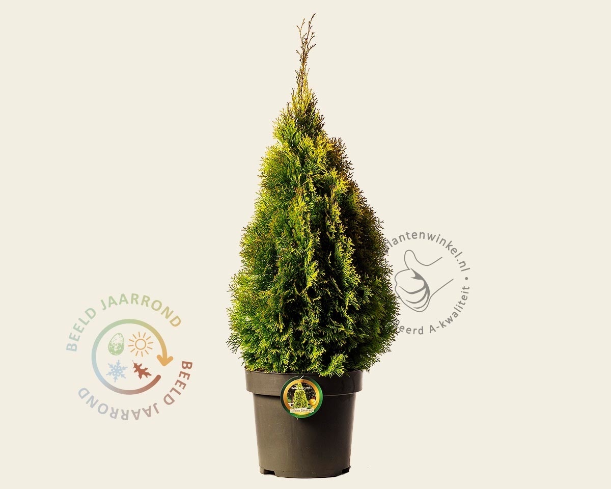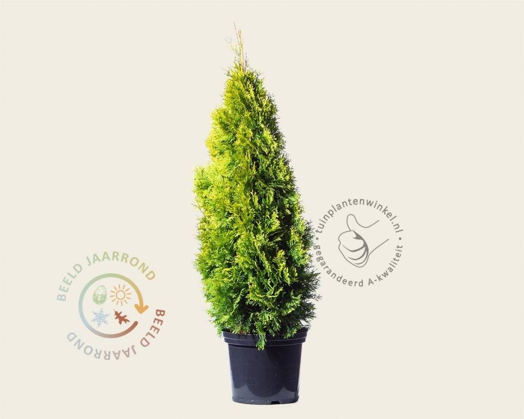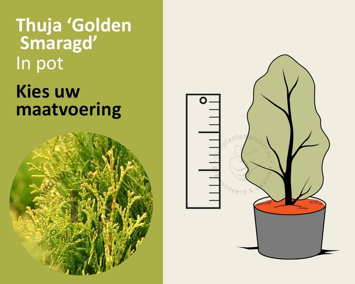 Een welkome aanvulling op het assortiment compact groeiende coniferen is deze variant van de Thuja 'Smaragd'. De Thuja occidentalis 'Golden Smaragd' of 'Janed Gold' is wat groei betreft gelijk aan haar groenbladige zus, maar heeft opvallende geel/groen gekleurde schubben, die in de winter een gouden gloed krijgen. Deze tuinplant groeit vrij langzaam in een kegelvorm en is daarom geschikt als vakbeplanting, als solitair met een mooi kleuraccent in de border of als kuipplant op het balkon en terras, maar voldoet door zijn compacte vorm ook prima als haagplant. De tuinplant is wintergroen en vorstbestendig.