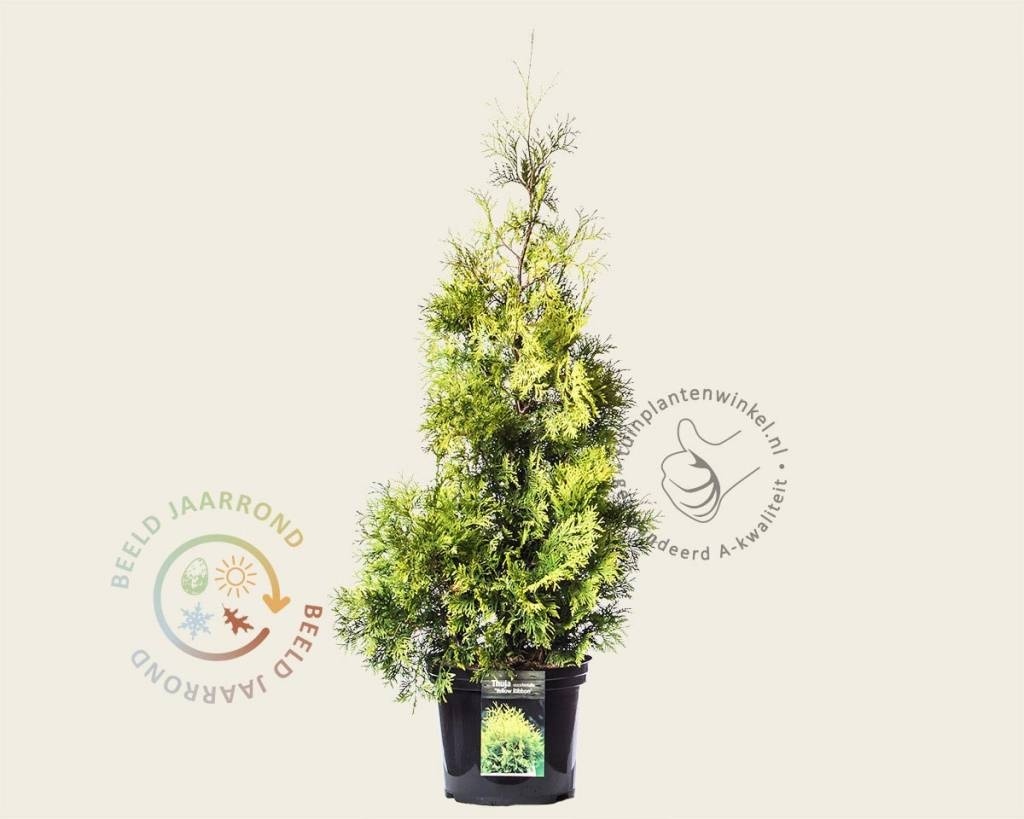 Thuja occidentalis 'Yellow Ribbon' in pot of Westerse levensboom