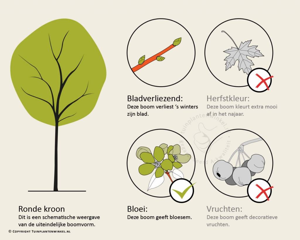 Antwoord: De kroon van deze boom groeit breed piramidaal uit en kan een volwassen breedte krijgen van wel 6 meter.