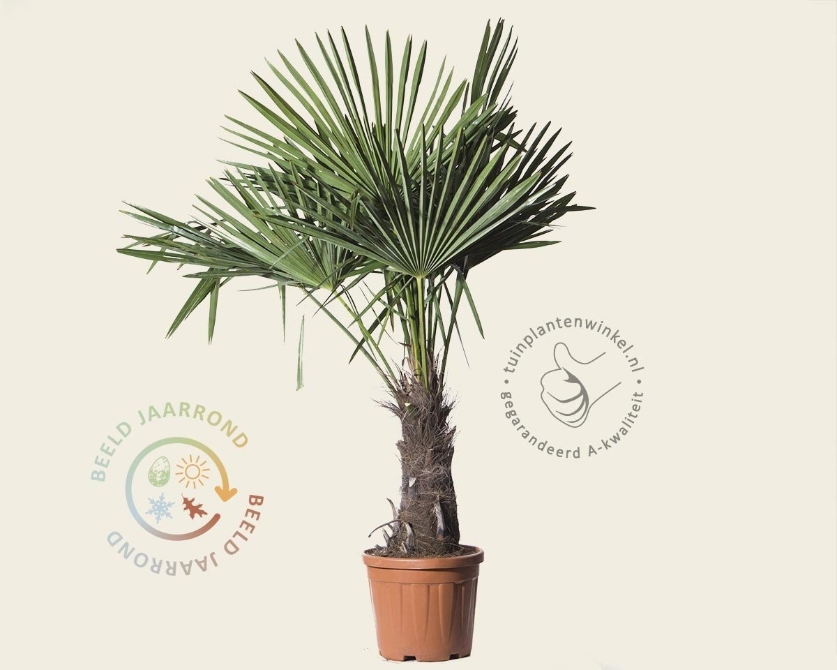 Een palmboom in de Benelux... Dat kan toch niet? Toch wel! Met deze Trachycarpus haalt u de sfeer van de Mediterranee naar uw eigen tuin of balkon! En met een klein beetje aandacht overleeft deze palmboom gewoon de winter. Van deze palmbomen wordt gezegd dat ze tot 18 graden vorst verdragen. We raden aan de plant extra te beschermen bij temperaturen kouder dan -10 graden celsius.