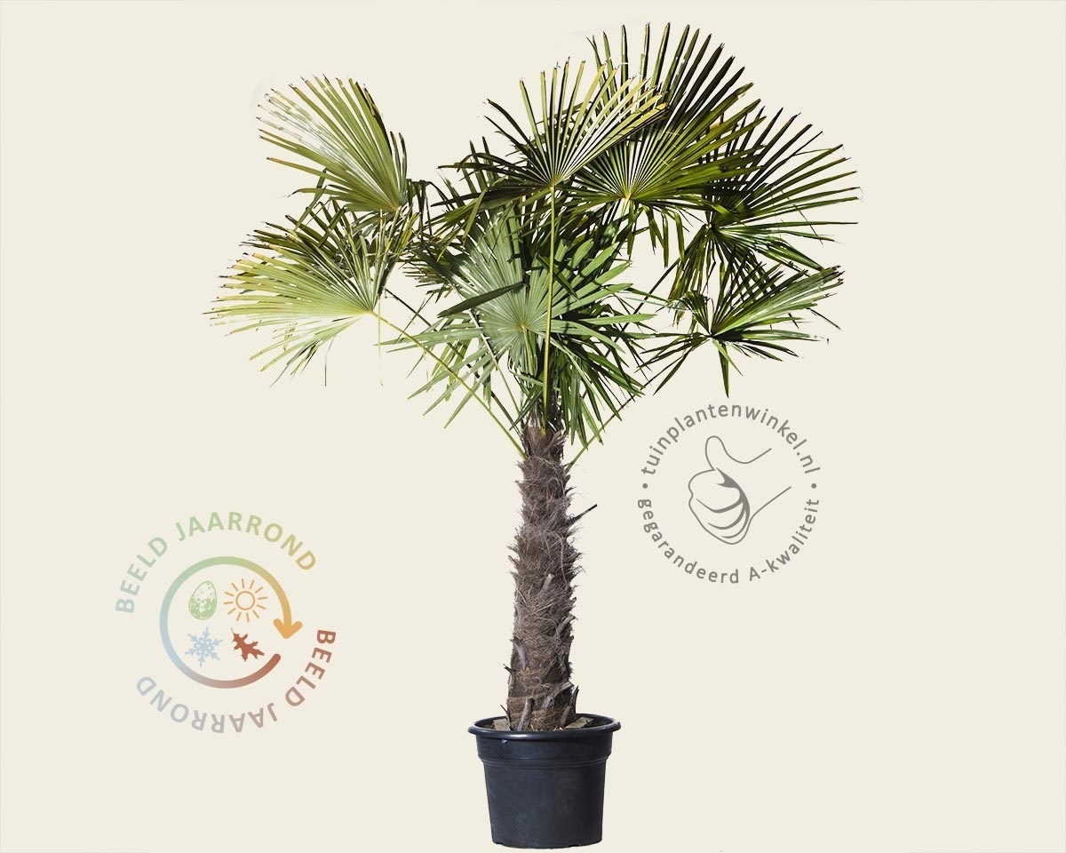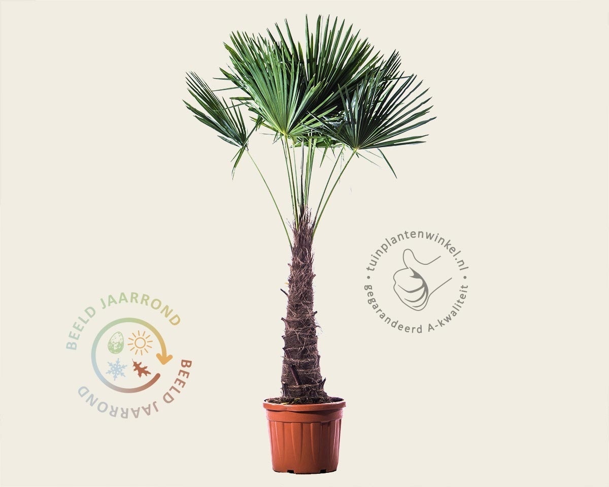 Een palmboom in de Benelux... Dat kan toch niet? Toch wel! Met deze Trachycarpus haalt u de sfeer van de Mediterranee naar uw eigen tuin of balkon! En met een klein beetje aandacht overleeft deze palmboom gewoon de winter. Van deze palmbomen wordt gezegd dat ze tot 18 graden vorst verdragen. We raden aan de plant extra te beschermen bij temperaturen kouder dan -10 graden celsius.